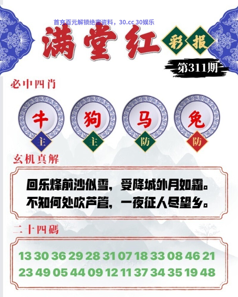 313期满堂红彩报:荷叶生时春恨生,荷叶枯时秋恨成。深知身在情长在,怅望江头江水声。 六肖:马猪龙猴鸡羊 三肖:马猪龙 特码:24.36.07.43.02.38.10.22.21.33.23.35 |